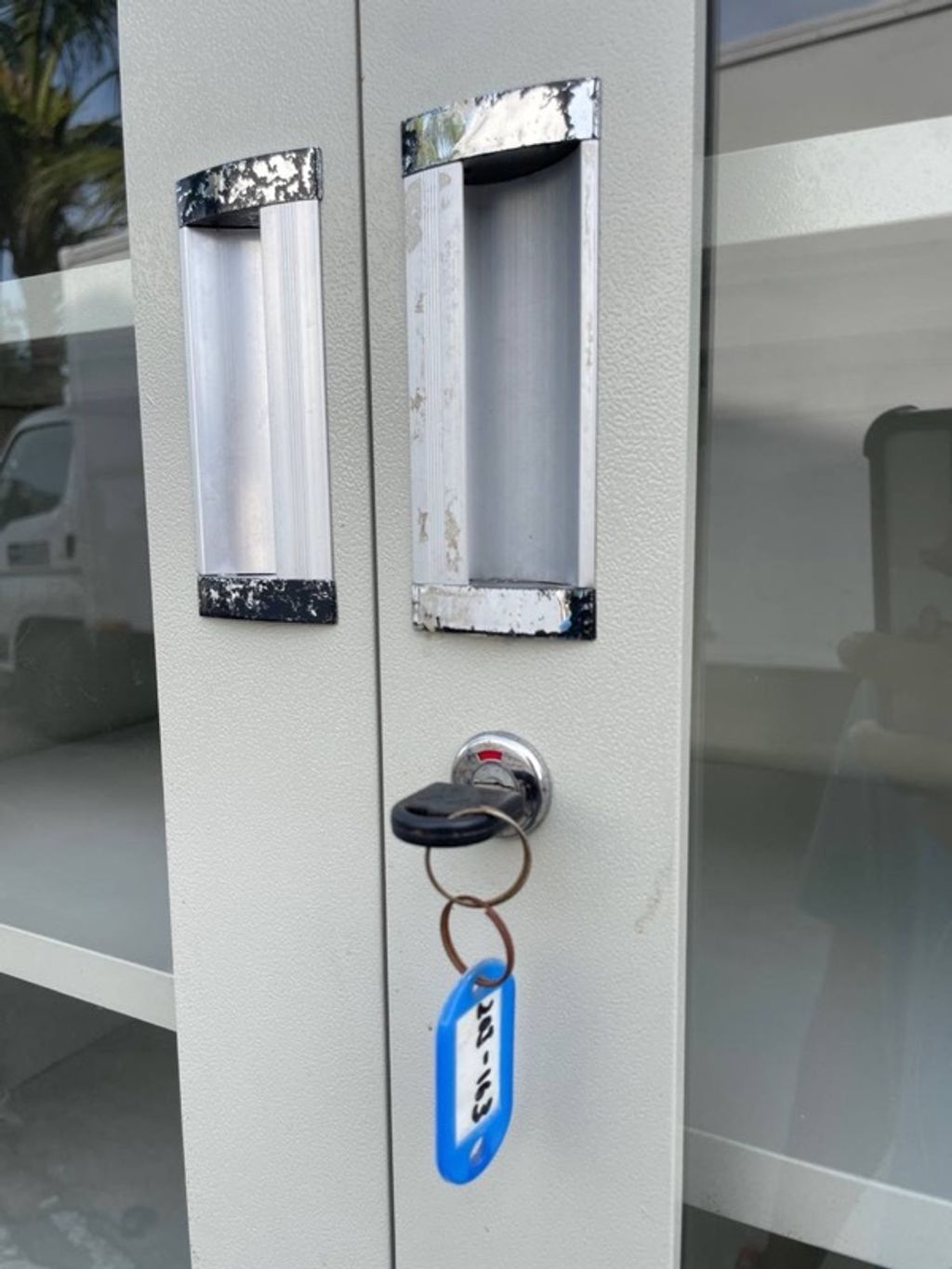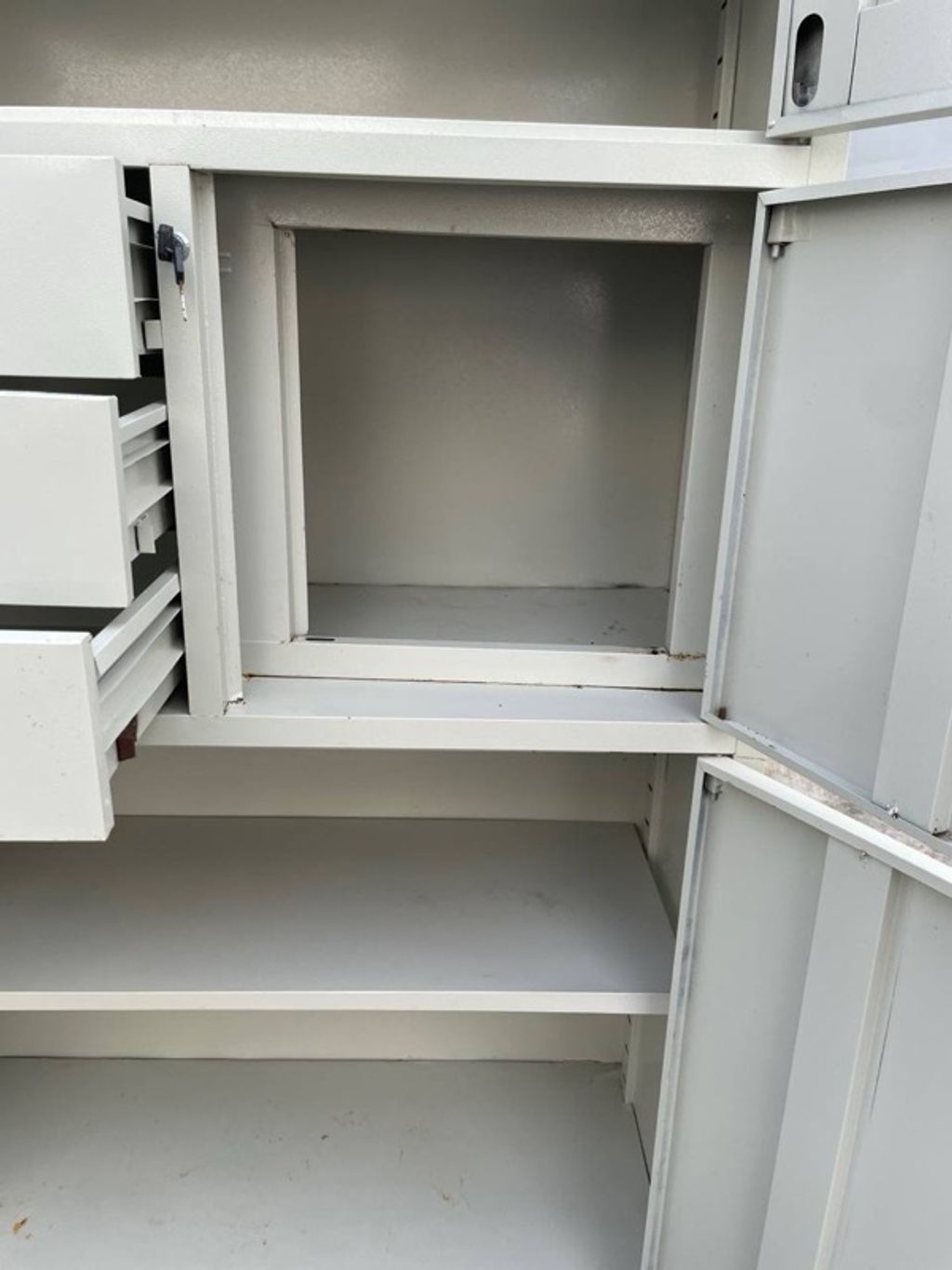 P28-Y Almari Besi Pameran 5 Doors 3 Drawers Full Height Metal Display Cabinet Creamy